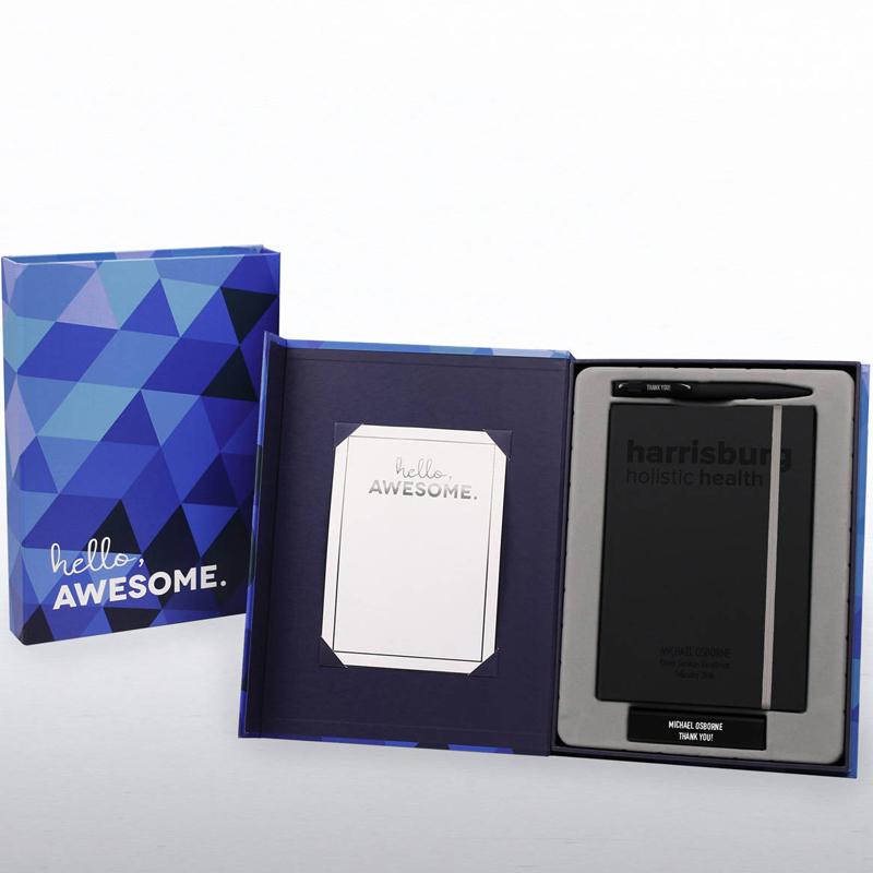 Includes: 5.5" x 8.5" perfect bound journal, ballpoint pen, certificate, and power bank.